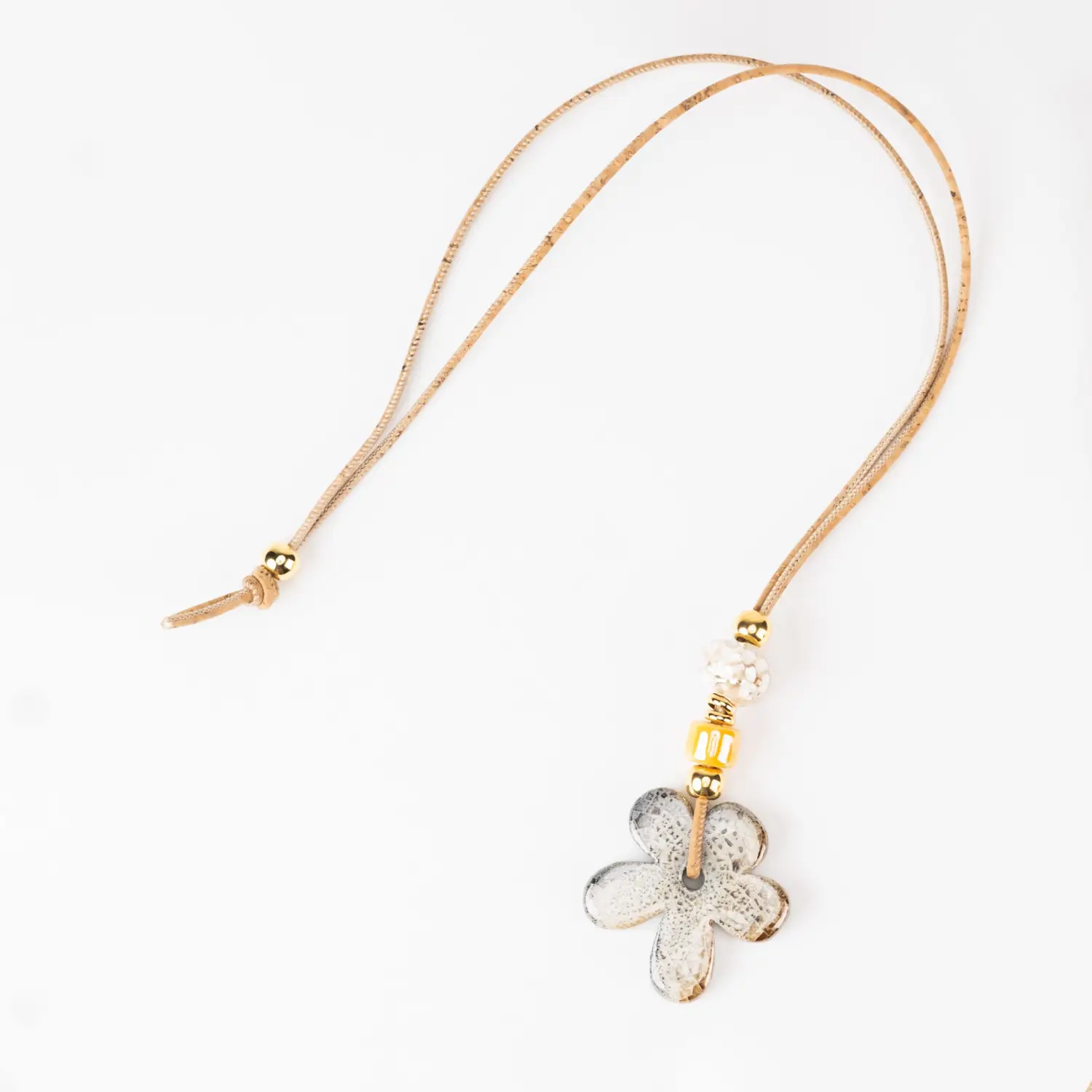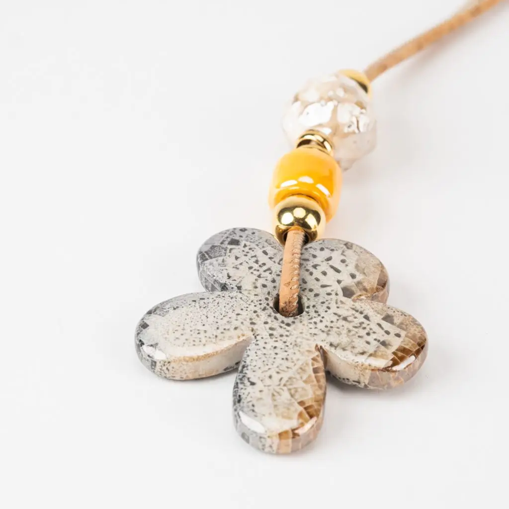 The large flower ceramic cork necklace features a combination of natural and elegant materials.