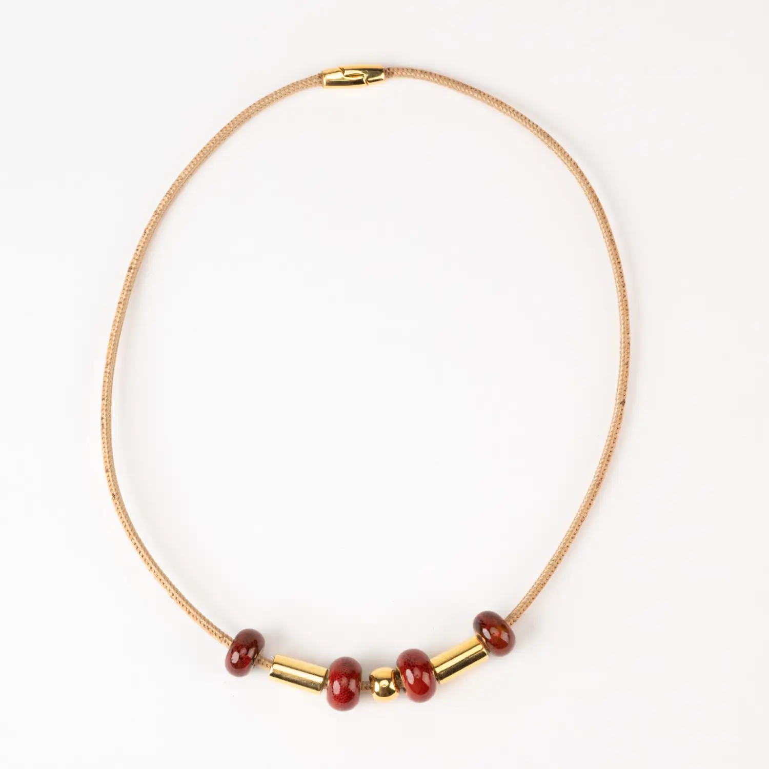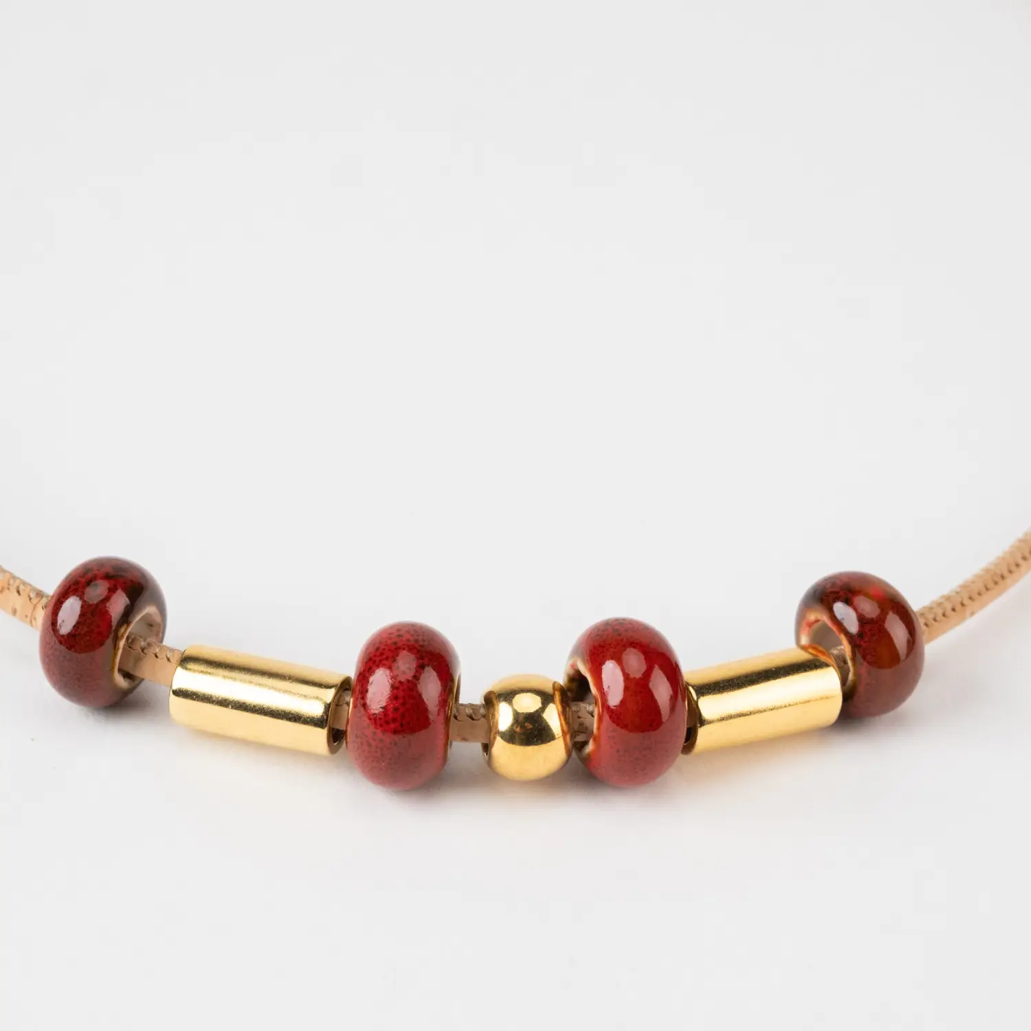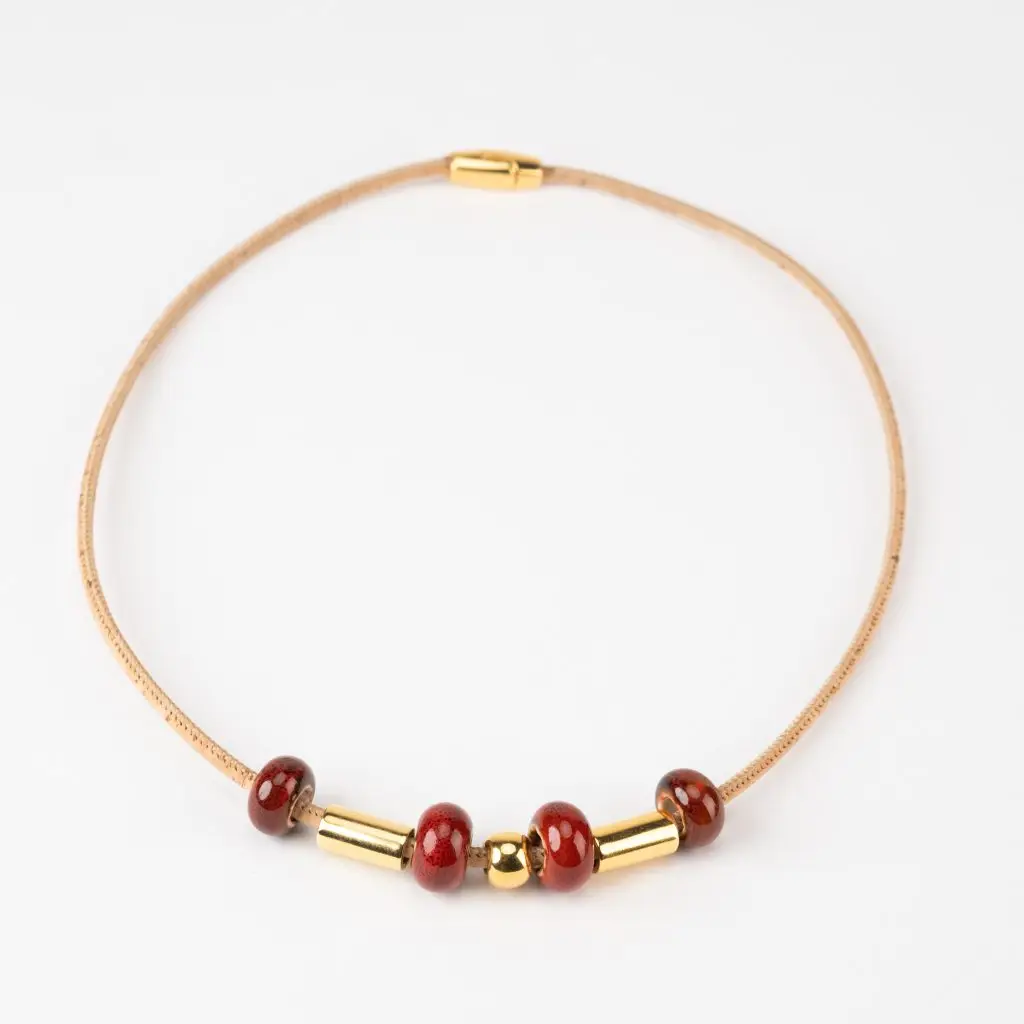 The cork necklace with reddish-orange ceramic and gold terminal is a sophisticated and vibrant piece that combines natural materials with a touch of elegance.