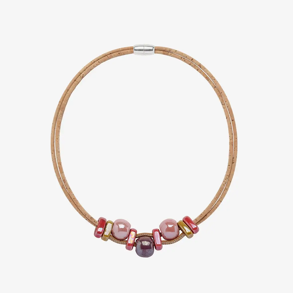 Handmade necklace made from natural cork, adorned with rounded ceramics that convey lightness and harmony.