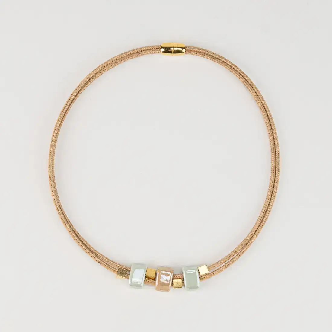 Natural cork necklace with two loops, enriched with ceramic pieces in blue and natural tones.