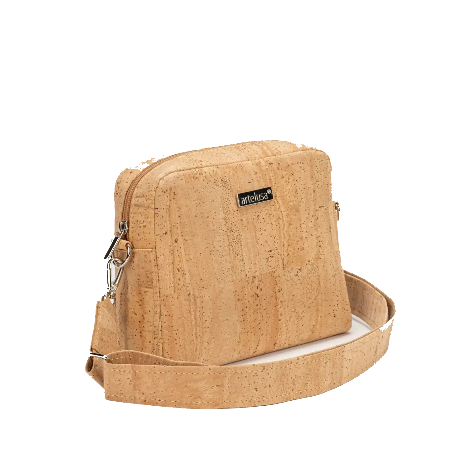 Natural cork shoulder bag with zipper closure, removable and extendable strap, silver metal hardware.
