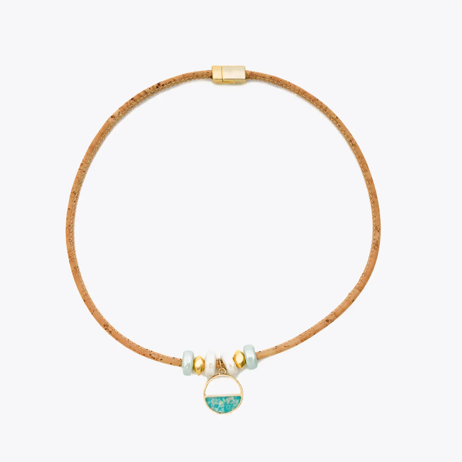 The combination of cork with the subtle shine of the gold ring and the freshness of the aquamarine stones and ceramics results in a unique, sophisticated piece of jewelry full of personality.