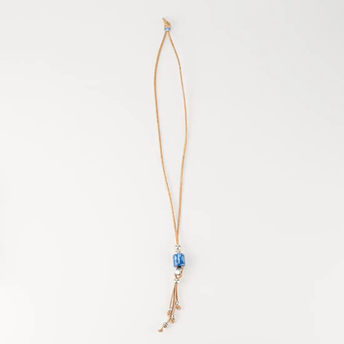 Long natural cork strand with an imposing ceramic centerpiece and delicate silver-tone pendants.