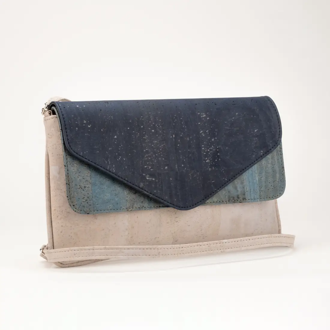 Cork shoulder bag with double flap and two entrances, magnetic snap closure.