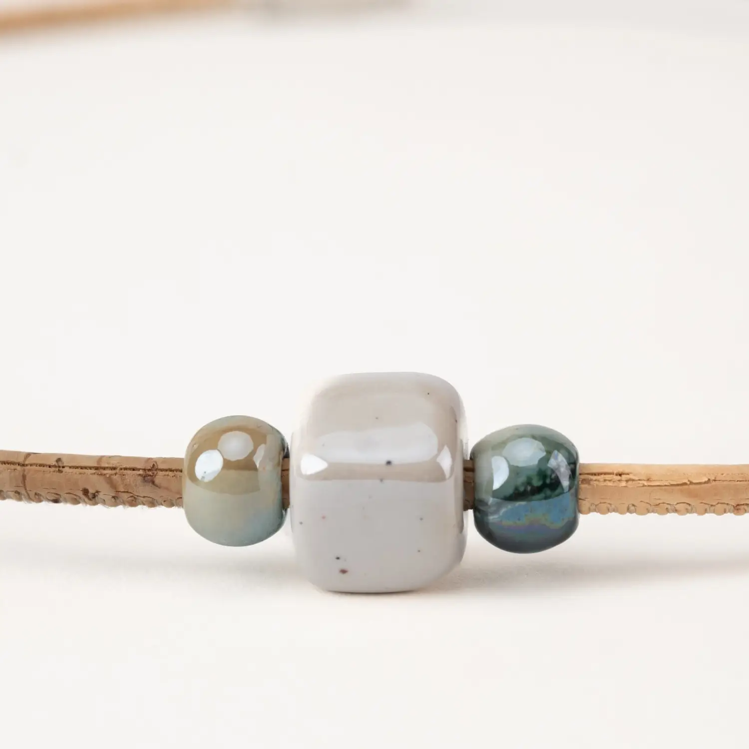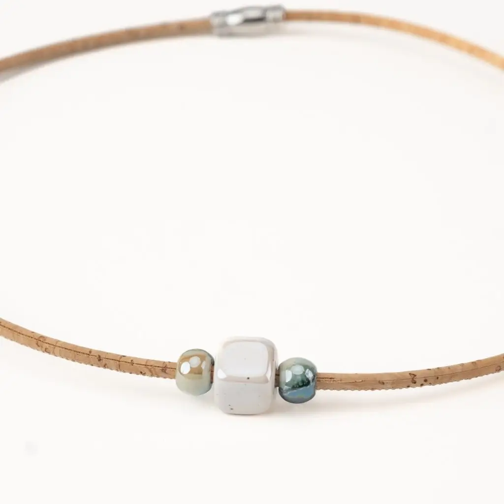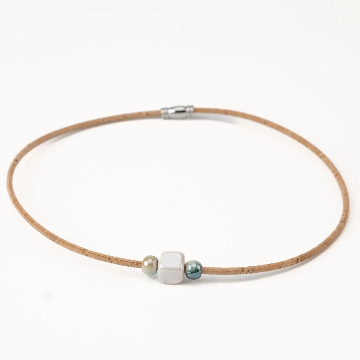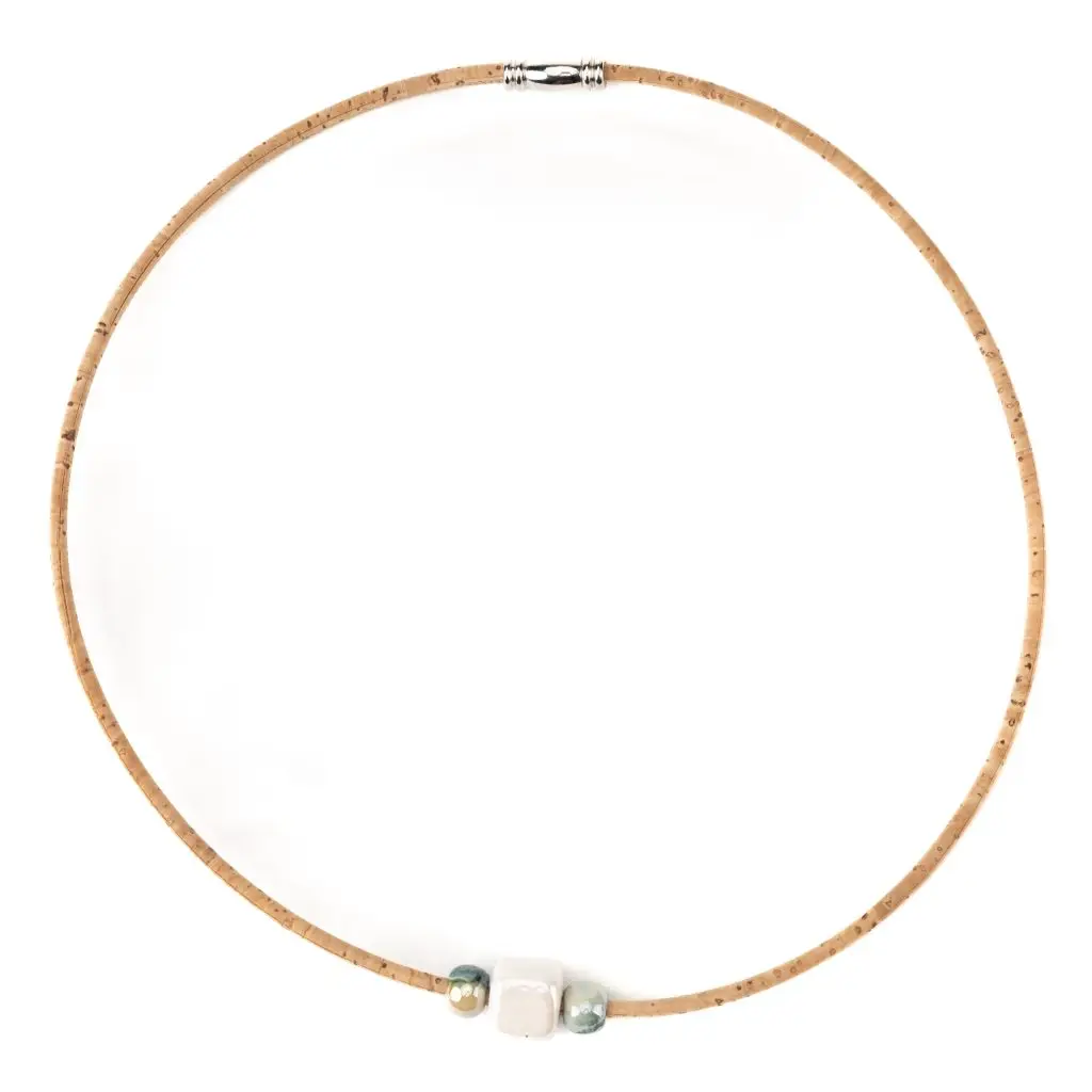 Colar em cortiça com cerâmica branca quadrada e cerâmica redonda verde mesclada.