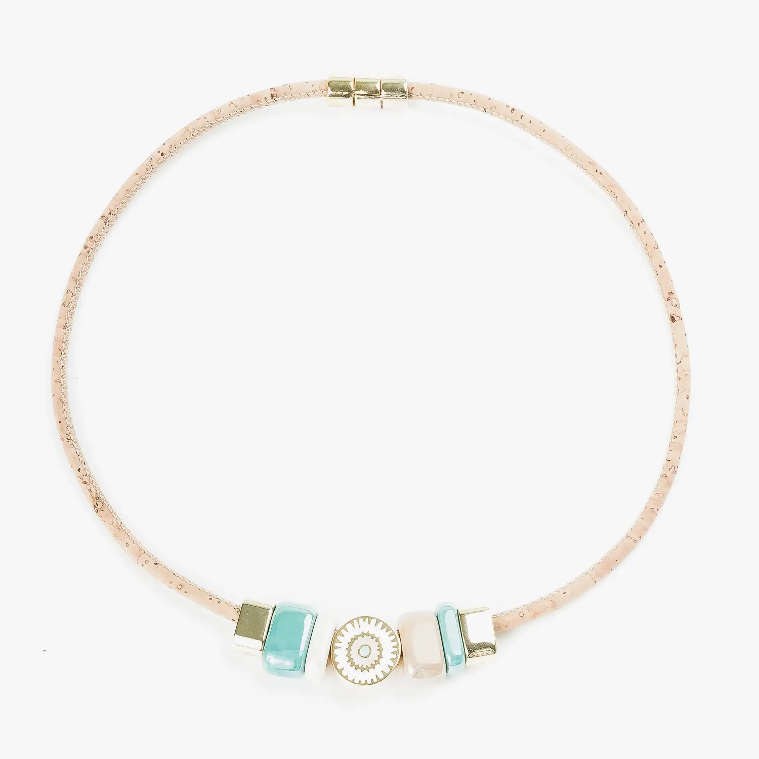 Colar em cortiça com cerâmicas coloridas e pendente em forma de infinito