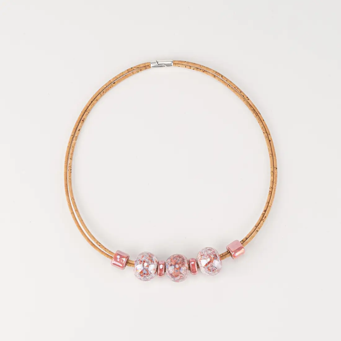 Colar em cortiça natural, com design elegante e contemporâneo, composto por contas redondas de cerâmica em tons de rosa mesclado e peças retangulares em cerâmica rosa sólida. A combinação de formas e tonalidades confere movimento, suavidade e um toque artístico à peça.