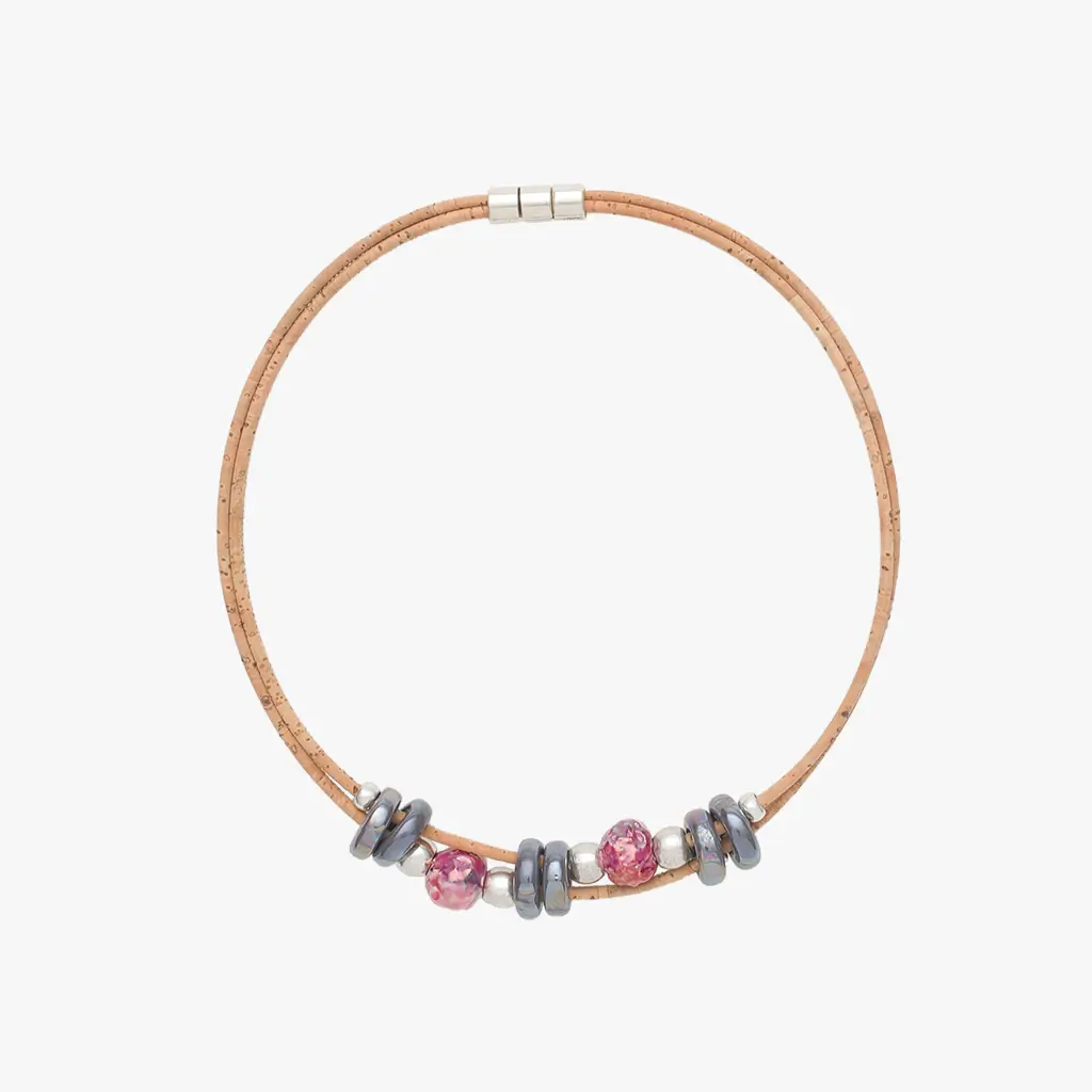 Colar em cortiça com cerâmicas rugosas.