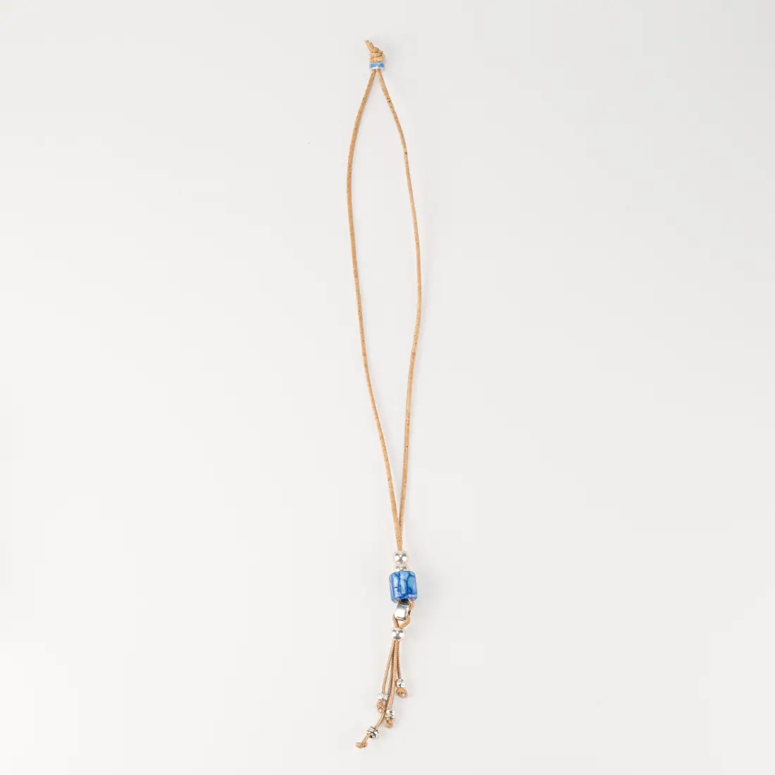 Colar artesanal feito à mão em cortiça natural, com contas de cerâmica redondas em tons de verde que evocam a harmonia da natureza. A combinação dos materiais confere à peça um estilo autêntico e contemporâneo, perfeito para diversas ocasiões.