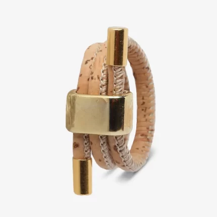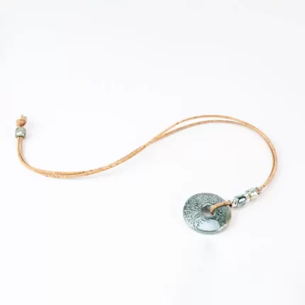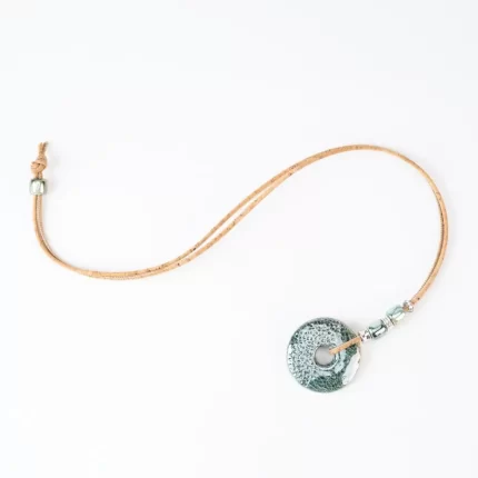 Colar em cortiça natural com duas voltas, enriquecido com peças de cerâmica nas tonalidades azul e natural. Esta combinação de cores transmite serenidade e elegância, tornando-o um acessório versátil para diferentes estilos e ocasiões. O design de duas voltas confere dimensão e originalidade à peça, destacando o equilíbrio entre o artesanal e o contemporâneo.