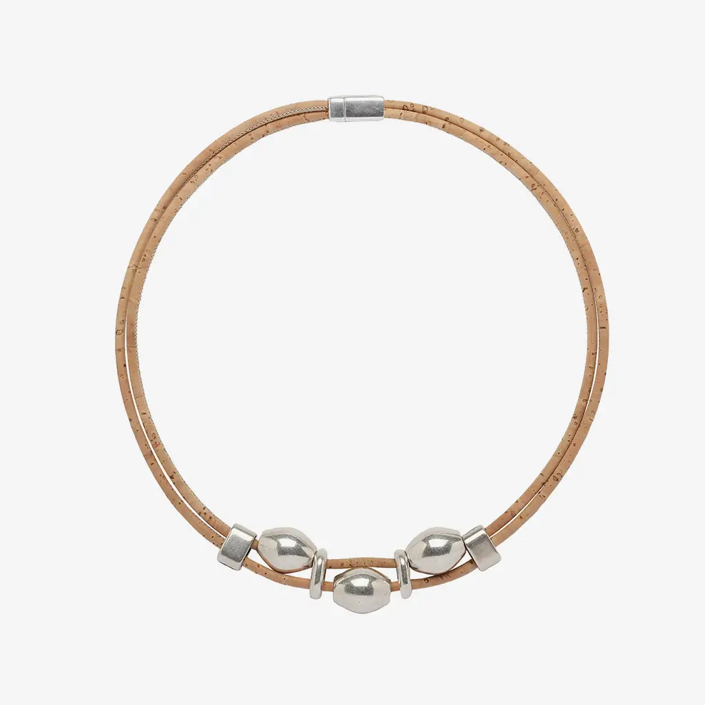 Colar em cortiça duas voltas com contas prateadas em tubos
