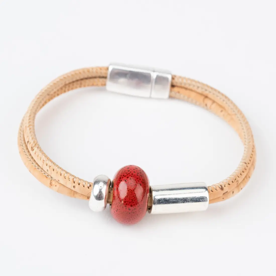 A pulseira é adornada com delicadas peças de cerâmica laranja, que adicionam um toque vibrante e sofisticado, criando um contraste harmônico com o tom suave da cortiça.